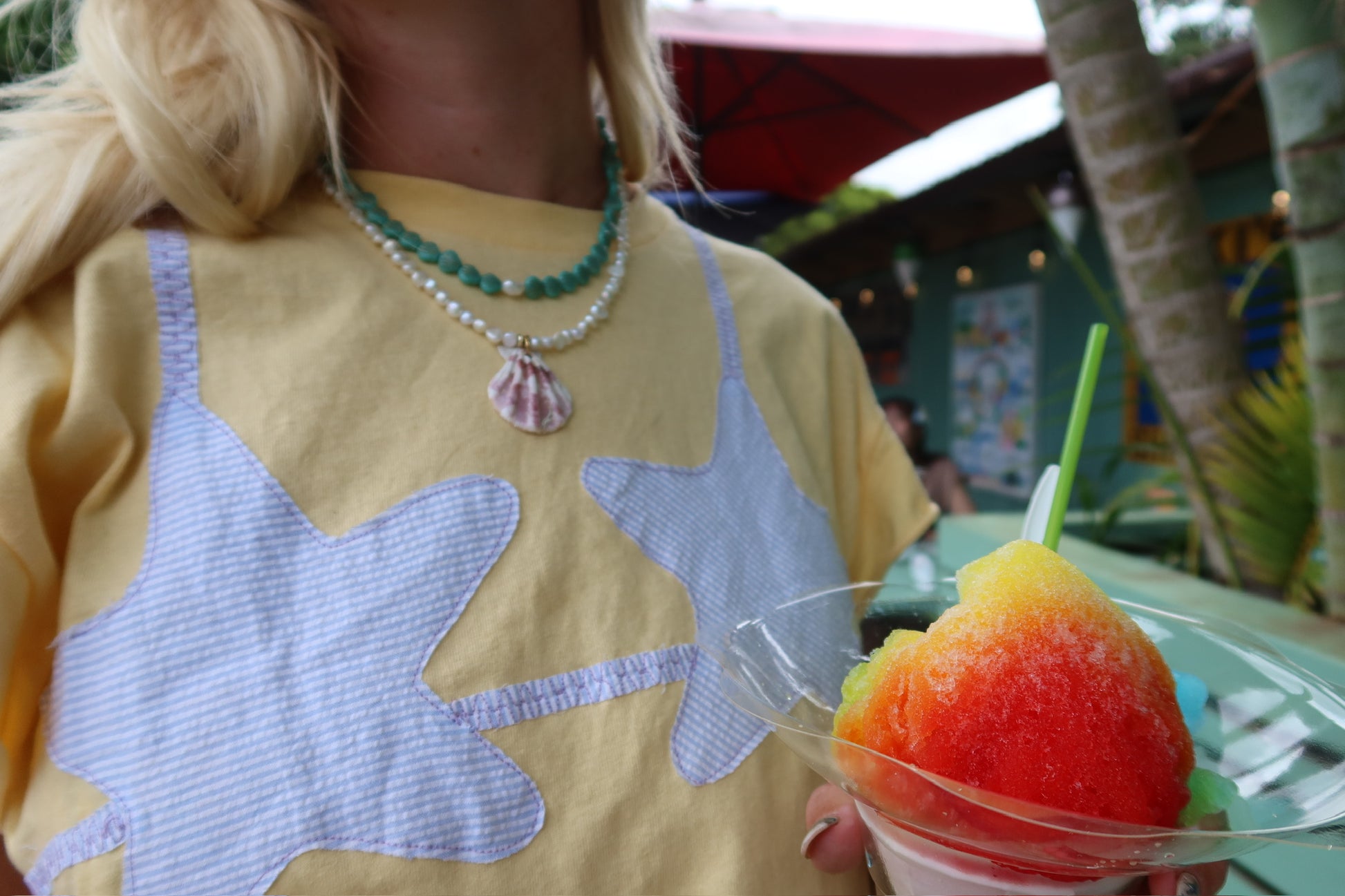 Blue and gold mini seashell beads with a saltwater pearl at its center. All non-tarnishing and the perfect splash of color!