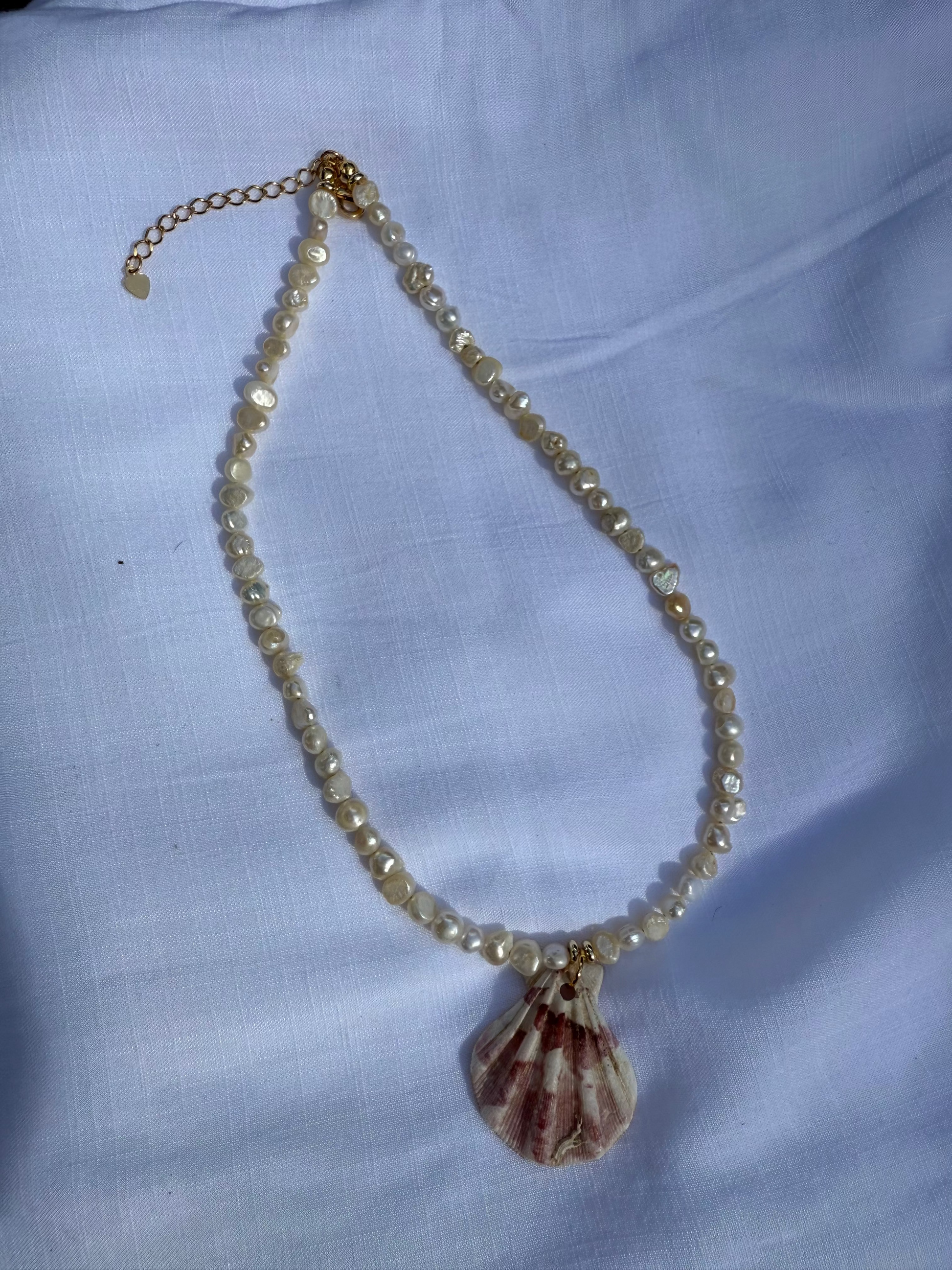 A must-have gem to your wardrobe. This saltwater pearl necklace features a gorgeous lavender sea shell at its center. Perfect way to dress up any outfit!