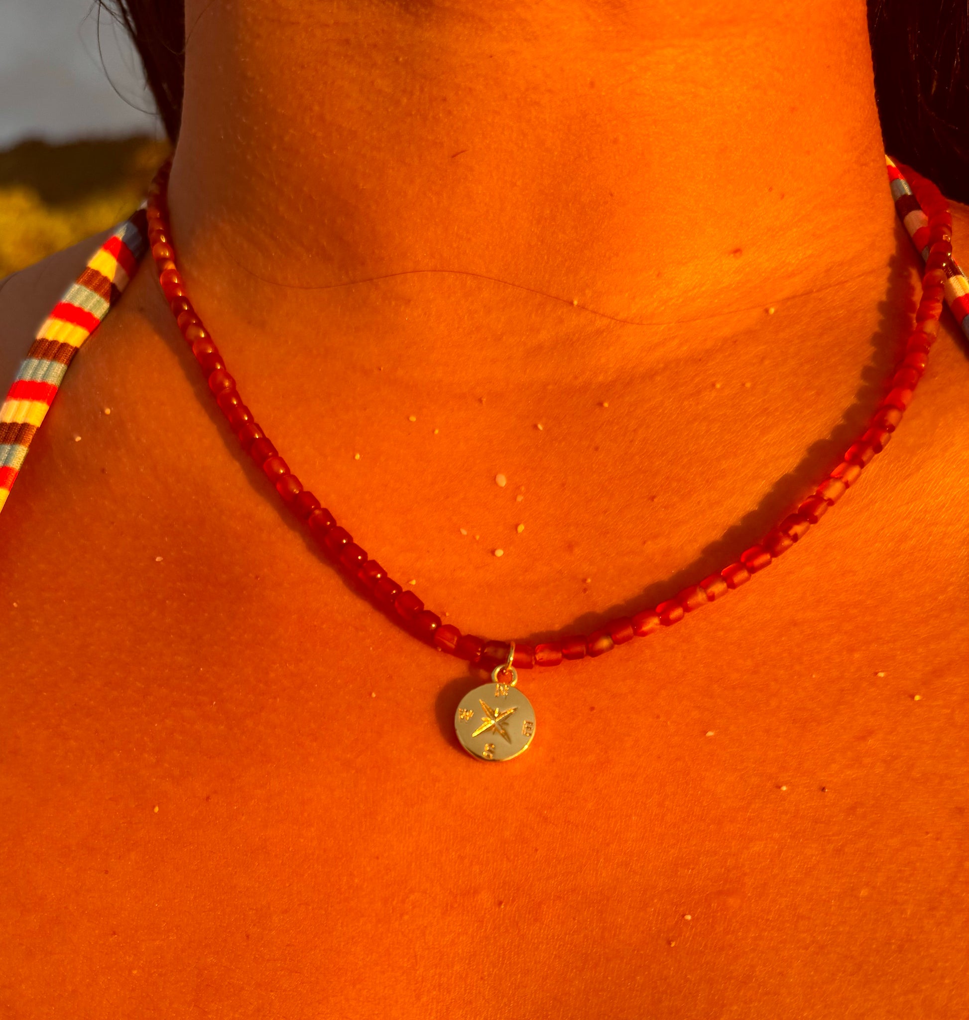 Mini red seed beads with an elegant gold-filled compass charm at the center. All pieces are non-tarnishing! Necklace extender included.