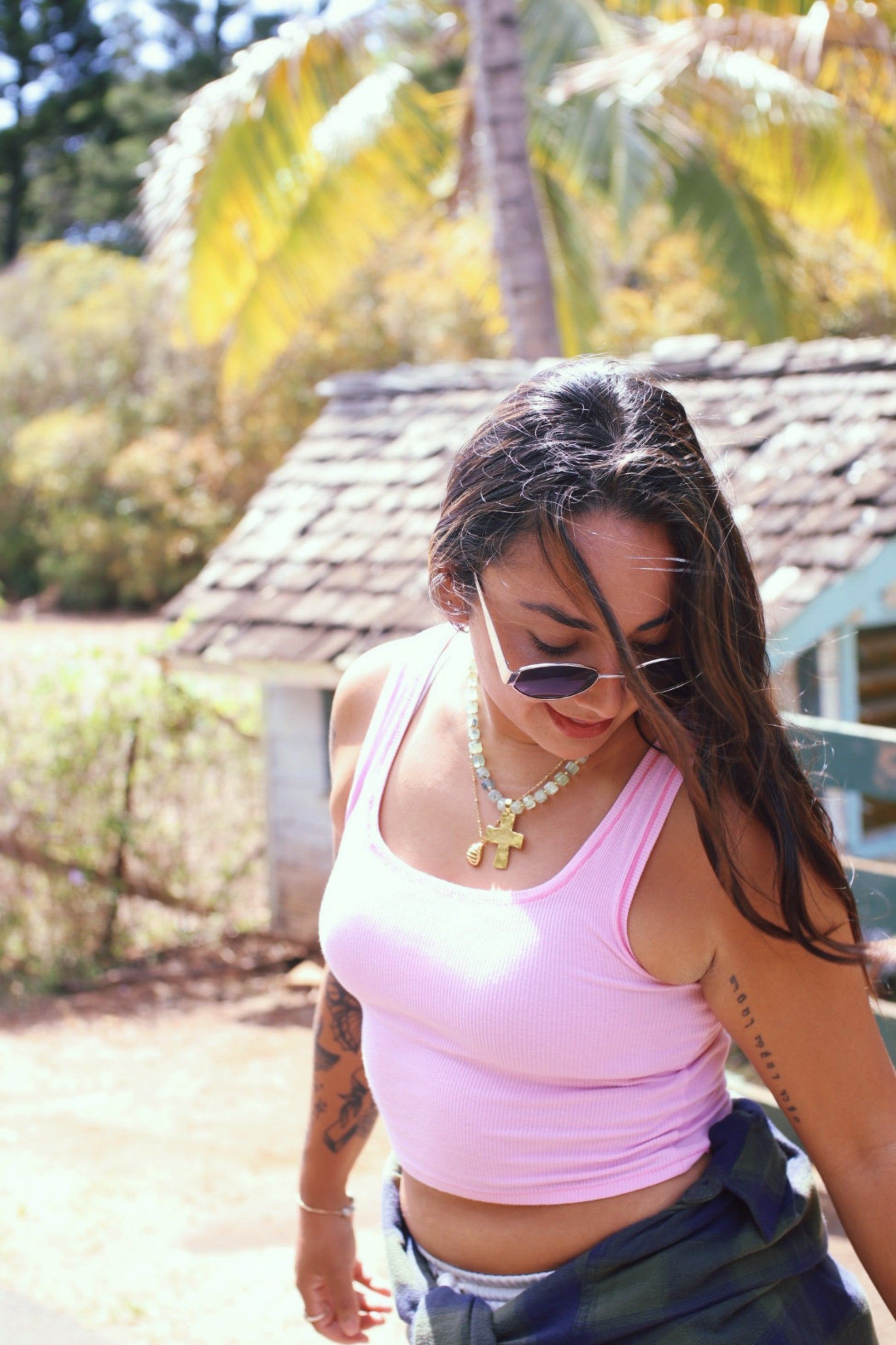 Experience the stunning elegance of this bold statement necklace featuring handmade hammered 24kt gold plated cross at its center, adorned with earthy sea foam green square beads. Transition seamlessly from summer to fall with this versatile piece.