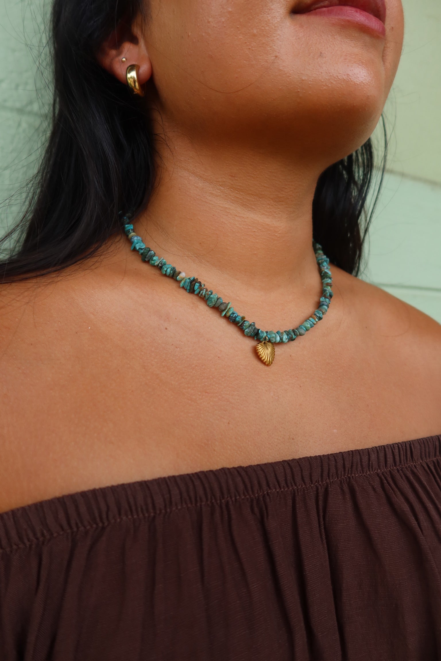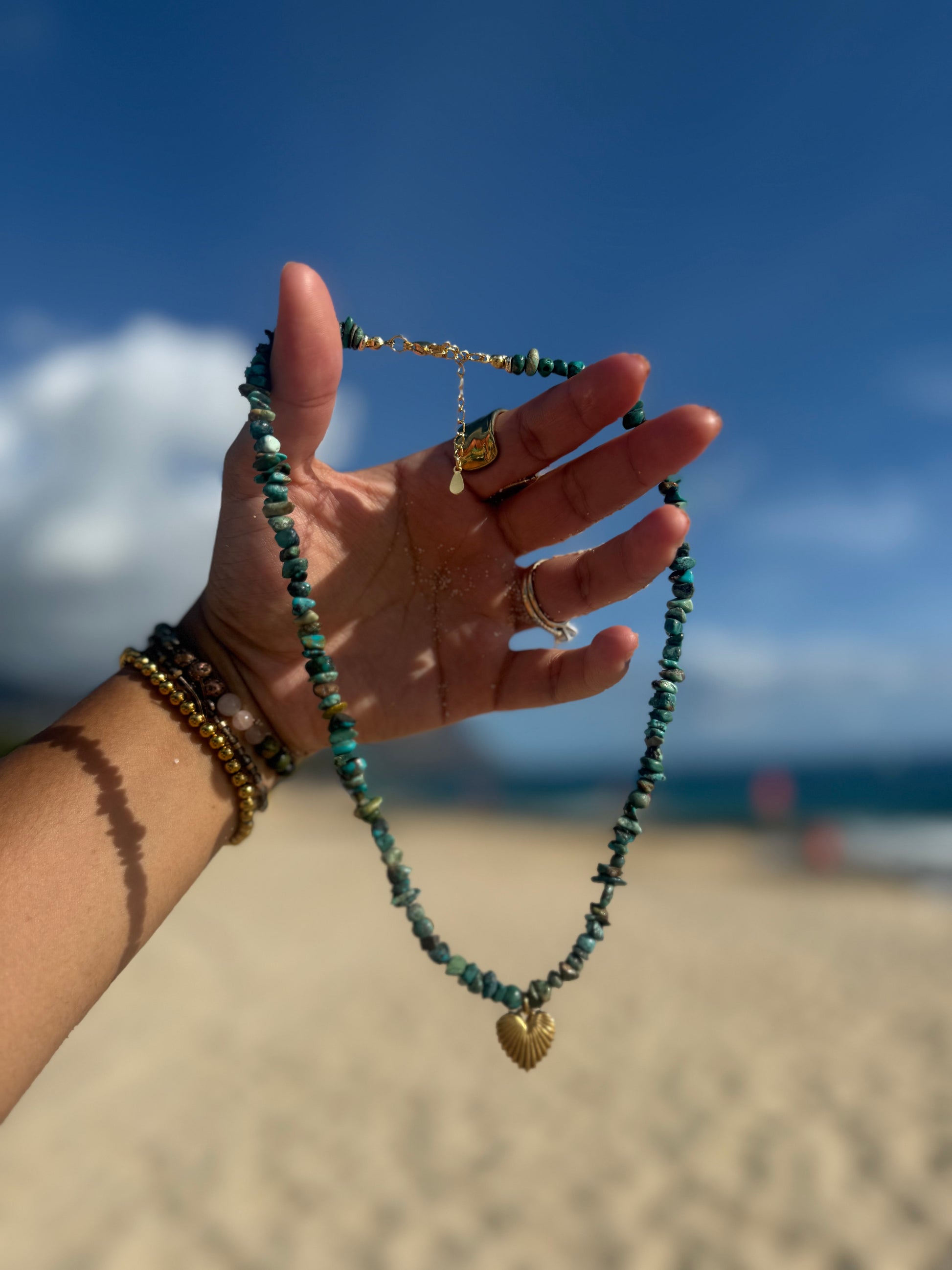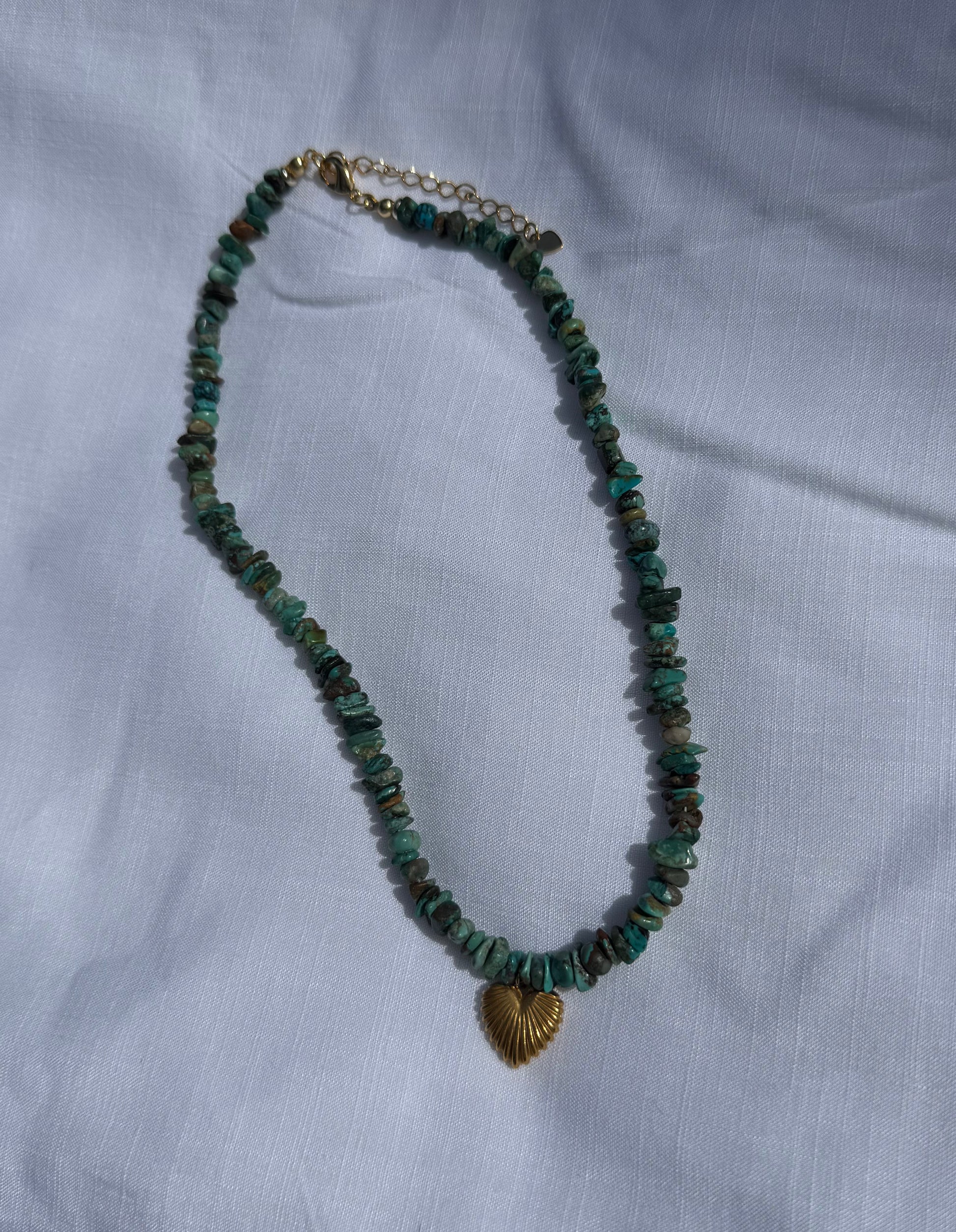 Earthy turquoise chip beads threaded with a stainless steel heart charm at the center. All non-tarnishing with an extender link attached!