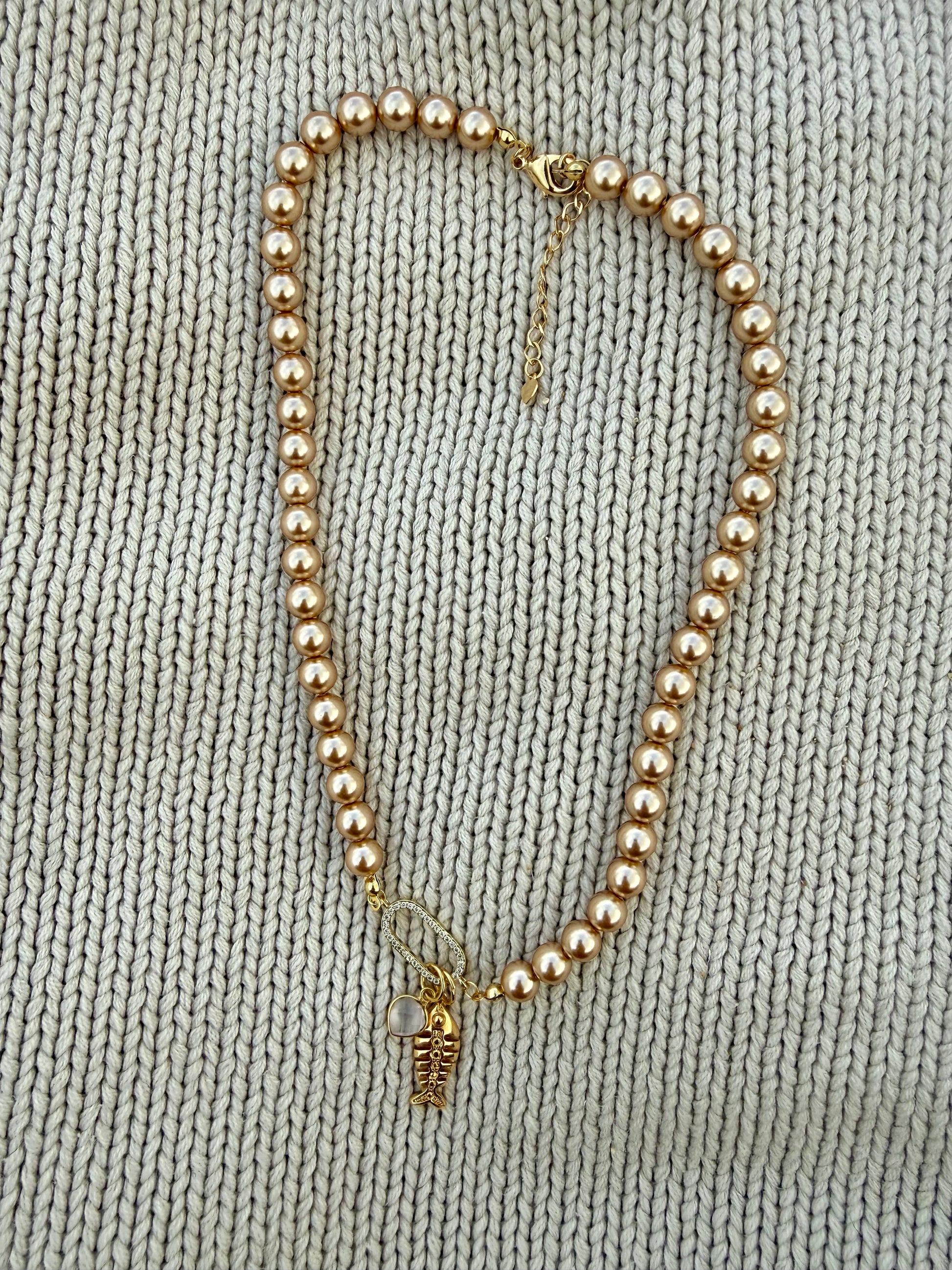 Add a touch of effortless elegance to your fall style with this Rose Gold Pearl Beaded Necklace. The soft shimmer of rose gold pearls beautifully complements the gold-filled charms, creating the perfect layering piece for cozy sweaters and autumn tones.
